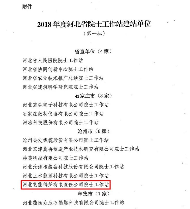 河北省為了推動(dòng)科技英才“雙百雙千”工程,吸引國(guó)內(nèi)外高端智力參與我省經(jīng)濟(jì)建設(shè),經(jīng)省科技廳、省委組織部、省科協(xié)一致決定設(shè)立院士工作站。2018年僅有14個(gè)單位入圍,其中就包括吳橋縣河北藝能鍋爐有限公司。