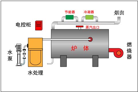 1.采用濕背式內燃兩回程結構,鍋爐頂部帶有頂盤管,有效的防止了火焰直接輻射后墻,同時在緊湊的結構前提下,增加了輻射受熱面積,提高了鍋爐的熱效率。